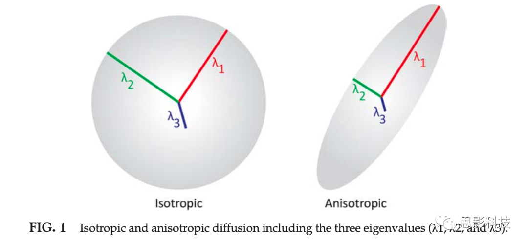 彌散加權(quán)成像技術(shù)通過探測組織內(nèi)水分子的受限性擴(kuò)散運(yùn)動,從而對白質(zhì)纖維束的結(jié)構(gòu)組織進(jìn)行可視化測量。當(dāng)水分子擴(kuò)散不受任何障礙物(如,細(xì)胞膜)阻礙時,其擴(kuò)散系數(shù)在所有方向都是均等的。在這種情況下,如果測量從某個特定點(diǎn)的擴(kuò)散屬性時,水分子的運(yùn)動將呈現(xiàn)為一個從中心點(diǎn)擴(kuò)散出來的球體。這種不受任何阻礙的水分子擴(kuò)散被稱為各向同性(isotropic)。然而,在人體組織當(dāng)中,存在許多阻礙水分子擴(kuò)散的因素(如,細(xì)胞膜,白質(zhì)中的髓鞘組織)。當(dāng)水分子擴(kuò)散遇到這些阻礙時,擴(kuò)散運(yùn)動的球體將會受到干擾,擴(kuò)散運(yùn)動將會變得不再勻稱。在這種情況下,再測量某個特定點(diǎn)的擴(kuò)散屬性時,水分子的擴(kuò)散將呈現(xiàn)為一個不勻稱的橢球形。這種受到阻礙的水分子擴(kuò)散被稱為各向異性(anisotropic)。在白質(zhì)腦區(qū),包裹軸突的髓鞘組織是阻礙水分子擴(kuò)散的主要因素。白質(zhì)纖維束結(jié)構(gòu)使組織內(nèi)的水分子沿著軸突走向平行擴(kuò)散,但在垂直方向受到限制。基于該現(xiàn)象,DW-MRI能夠?qū)Υ竽X中的白質(zhì)纖維束進(jìn)行識別。在一些主要的白質(zhì)纖維束中,由于聚集著眾多有髓軸突纖維束,因此水分子擴(kuò)散會呈現(xiàn)高度的各向異性。