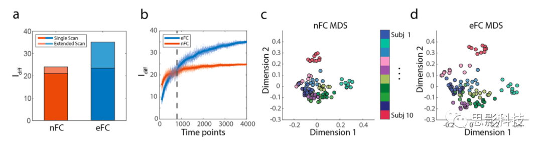 (d)使用多維尺度分析繪制了被試的eFC掃描圖。每個被試的掃描結(jié)果分別對應(yīng)于c-d之間色帶上的一種顏色。