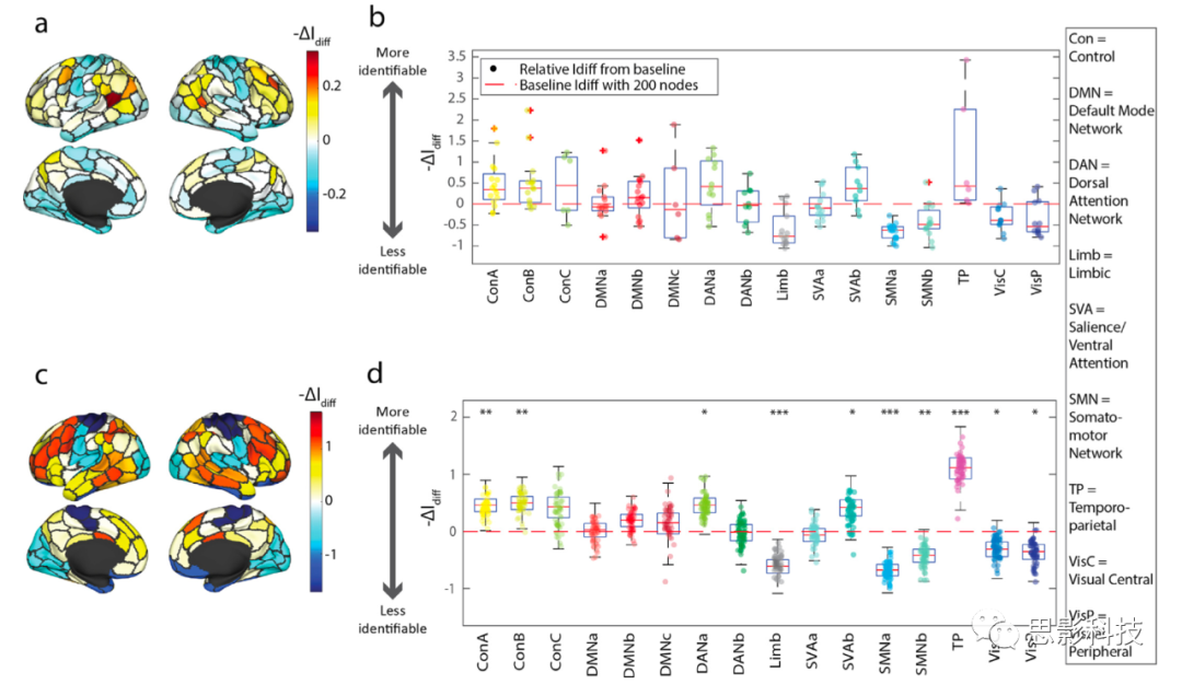 (c)在構(gòu)建eFC之前排除整個系統(tǒng)的節(jié)點,揭示了特定系統(tǒng)對Idiff的正面或負(fù)面影響,并且(d)與隨機去除匹配數(shù)量的節(jié)點相比,對Idiff有明顯不同的結(jié)果(Bonferroni校正的p值;* = p < 0.003, ** = p < 0.0006, *** = p < 0.00006)。為了直觀的展示結(jié)果,我們將ΔIdiff倒置為-ΔIdiff,它量化了一個節(jié)點的移除對整體Idiff的相對影響。如果一個節(jié)點的移除導(dǎo)致Idiff的降低,這個節(jié)點對識別能力的貢獻(xiàn)將被認(rèn)為是"增加Idiff"。