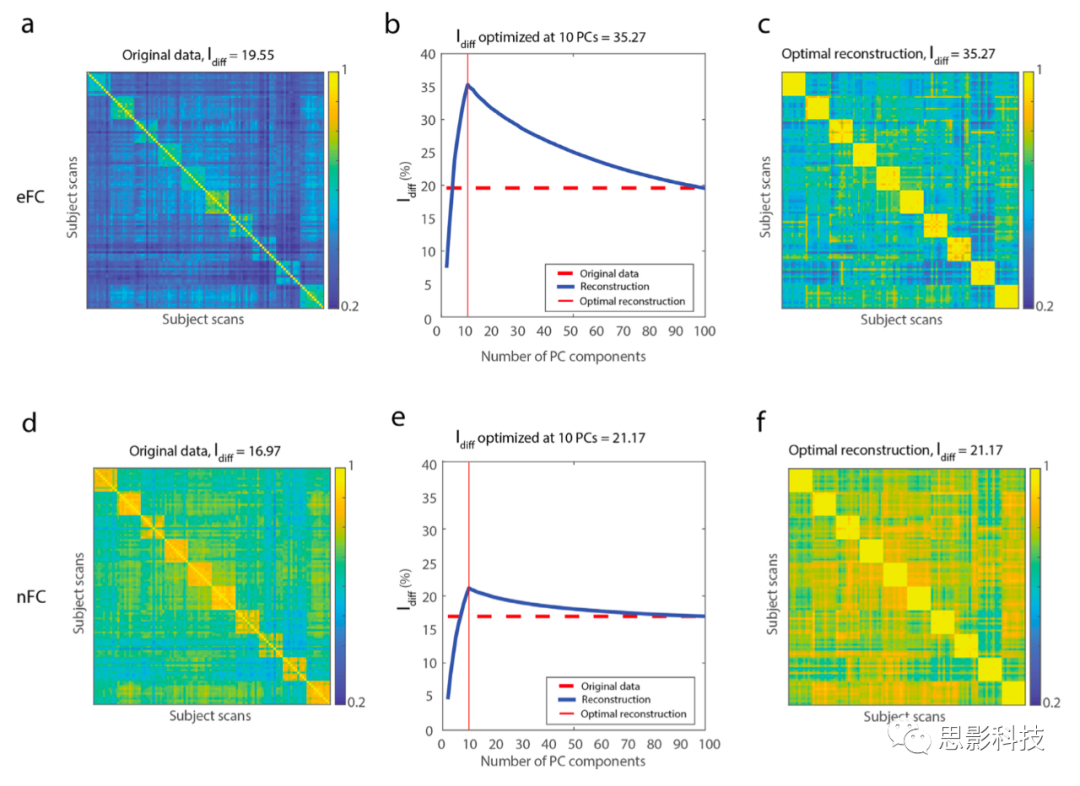 本研究中我們著重使用完整的eFC矩陣或其連邊-連邊連接的特定子集進(jìn)行Idiff的計算。作為最后的分析,我們想測試是否可以通過使用相對較少的主成分優(yōu)化重建eFC來提高差異識別能力。