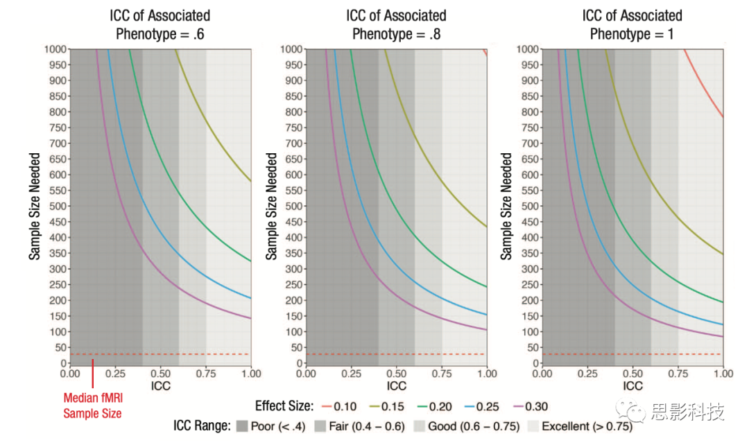 圖1. 任務(wù)態(tài)fMRI重測可靠性樣本量的大小對檢測大腦與行為相關(guān)性80%檢驗力的影響。曲線顯示了與行為或臨床表型相關(guān)的三個水平的可靠性。圖像采用R中的pwr.r.test函數(shù)繪制。r的值根據(jù)附錄中的衰減公式指定。ICC= intraclass correlation coefficient,組內(nèi)相關(guān)系數(shù)。