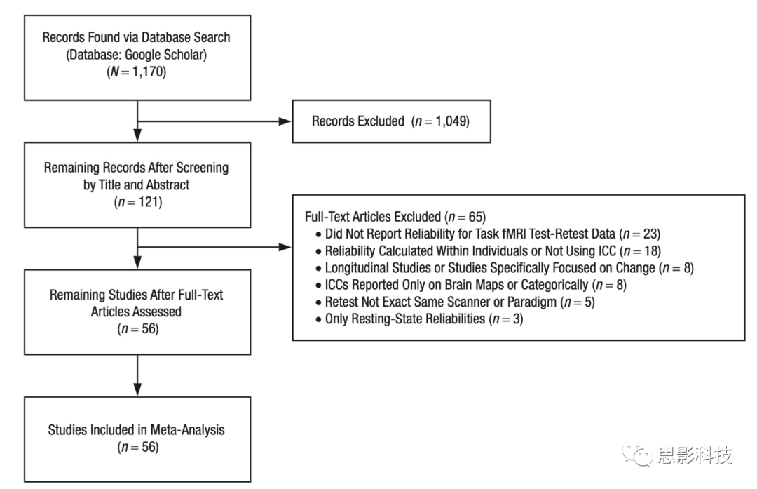 作者按照PRISMA指南進行系統(tǒng)回顧和元分析,在谷歌學(xué)術(shù)上搜索了2019年4月1日或之前發(fā)表的包含任務(wù)態(tài)fMRI激活重測可靠性估計的英文同行評審文章。使用高級搜索查找包含所有“ICC”(即組內(nèi)相關(guān)系數(shù))、“fMRI”和“retest”以及至少一個術(shù)語“ROI”、“ROIs”、“region