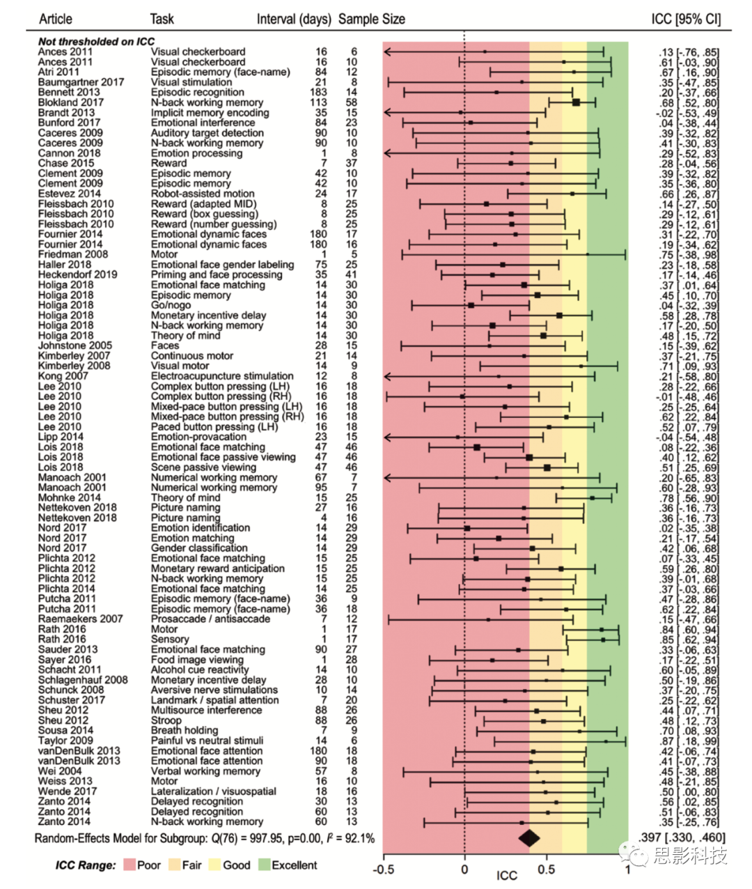 圖3顯示了來自77個報告無閾值化的子研究的重測可靠性系數(shù)(ICCs)(平均值N = 19.6,中位數(shù)N = 17)。56%的數(shù)值可靠性較差(低于0.4),另外24%的數(shù)值可靠性尚可(0.4-0.6),只有20%的可靠性達到良好或極好的范圍(0.75以上)。隨機效應(yīng)元分析顯示,平均ICC為0.397(95% CI =[.330–.460], p < .001),處于較差的范圍。研究間存在異質(zhì)性(p = 0.04, I2 = 31.6)。