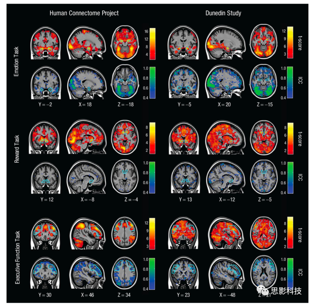 元分析的結(jié)果雖然具有啟發(fā)性但解釋起來并不簡單。首先,可靠性的估計來自大量的任務(wù)和樣本,因此單一的元分析可靠性估計可能會掩蓋真正可靠的任務(wù)態(tài)fMRI范式。其次,這些研究使用了不同的掃描儀(有些已經(jīng)過時)和不同的預(yù)處理和分析管道,為了解決這些限制,作者進一步分析了兩個新的數(shù)據(jù)集(這兩個數(shù)據(jù)集使用最先進的掃描儀和分析手段)來評估常用的認(rèn)知和情感任務(wù)中的個體差異。