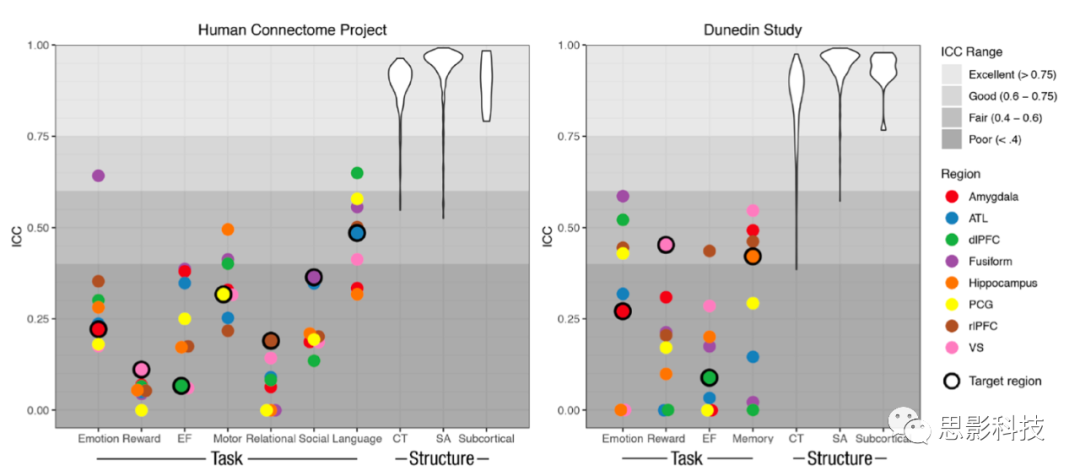 本文還評估了HCP和Dunedin 研究中11種常用的任務(wù)態(tài)fMRI的測量可靠性。與meta分析中包含的許多研究不同,這兩項研究是最近在現(xiàn)代掃描儀上完成的,使用了前沿的采集參數(shù)、最新的偽跡去除方法和最先進的預(yù)處理管道。然而,平均的重測可靠性也很差(ICC=0.228)。在這些分析中,并未發(fā)現(xiàn)針對特定任務(wù)的目標(biāo)ROI的可靠性會比非目標(biāo)ROI更好(目標(biāo)ROI平均ICC為0.270,非目標(biāo)ROI為0.228),以及并未發(fā)現(xiàn)任何特定任務(wù)或目標(biāo)ROI能夠始終產(chǎn)生高的可靠性。有趣的是,這兩項研究的可靠性估計比元分析的估計要小得多(元分析ICC = 0.397),可能是因為預(yù)注冊的分析通常比未預(yù)注冊的出版文章的分析產(chǎn)生更小的效應(yīng)量。