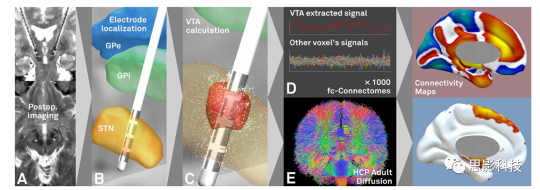 圖1:識別深部腦刺激(DBS)連通性的方法。處理步驟包括:獲取術(shù)前/術(shù)后成像(A),將DBS電極定位在標準空間(B),根據(jù)刺激參數(shù)(C)計算組織激活體積(VTA),然后使用高質(zhì)量的標準連接組數(shù)據(jù),計算VTA和大腦其他部分的功能(D)和結(jié)構(gòu)(E)連接。顯示了我們對標準連接組數(shù)據(jù)集的處理流程,并在所有主要分析中使用。對于功能連通性,正相關(guān)顯示在暖色中,而負相關(guān)(反相關(guān))顯示在冷色中(顏色版本在線提供)。