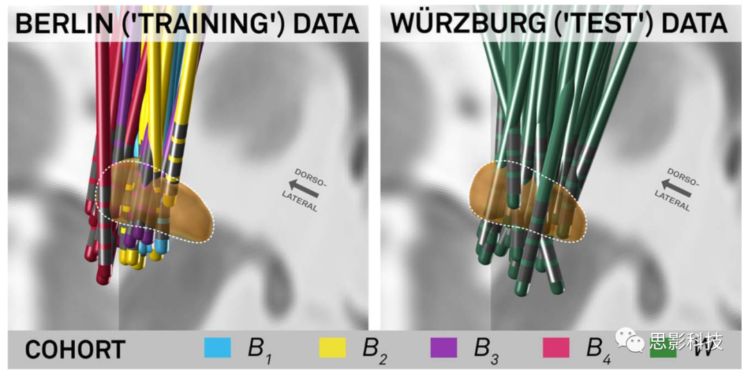 訓(xùn)練集(Berlin隊列)由4個亞組組成,分別在不同時間和不同研究中登記。這些亞組在臨床表現(xiàn)和DBS效應(yīng)方面具有異質(zhì)性,以盡量確保該訓(xùn)練集的結(jié)果具有普遍性。一個亞組由早期PD患者(B1)組成,一個亞組回顧性收集僅評估UPDRS反應(yīng)的病歷(B2),一個亞組由典型的、年齡平均的受STN刺激的研究人群組成(B3),1個亞組的DBS靶點靠近未定帶尾側(cè),而不是STN本身(B4)。該最終隊列的詳細臨床結(jié)果將另行報告。對于Berlin隊列中的所有患者,術(shù)后1至2年的DBS反應(yīng),以UPDRS運動評分的百分比變化來衡量。