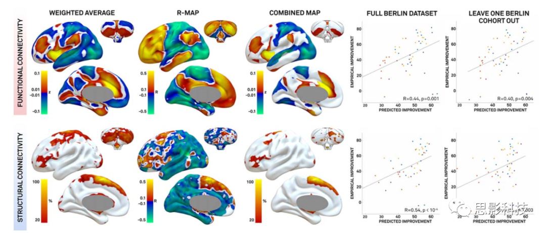 然后,使用Berlin數(shù)據(jù)集得出這些連接性圖譜(組合圖、正常連接組),用于預(yù)測獨立Würzburg數(shù)據(jù)集的臨床結(jié)果(圖4)。在這個獨立的數(shù)據(jù)集中,盡管治療中心、手術(shù)醫(yī)生和臨床評估時間存在差異,但是結(jié)構(gòu)連通性(R=0.45,P=0.002)和功能連通性(R=0.34,P=0.03)都是臨床預(yù)后的重要預(yù)測因素。
