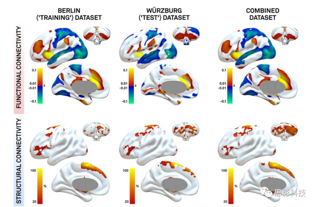 圖5:在不同數(shù)據(jù)集中,與臨床反應(yīng)相關(guān)的連接性圖是一致的。組合圖(加權(quán)平均圖和R圖)基于Berlin數(shù)據(jù)集(左)、Würzburg數(shù)據(jù)集(中)以及兩個數(shù)據(jù)組合集(右)。