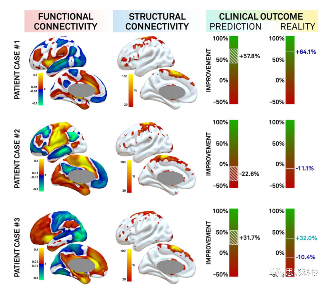 為了測試個體患者的預(yù)后預(yù)測是否可靠,同樣的GLM采用了“留一”法解決。換句話說,94名患者的數(shù)據(jù)用于預(yù)測第95名患者,并將預(yù)測改善與實際改善進行比較。報告了平均預(yù)測誤差,并選擇了3名患者作為示例結(jié)果。
