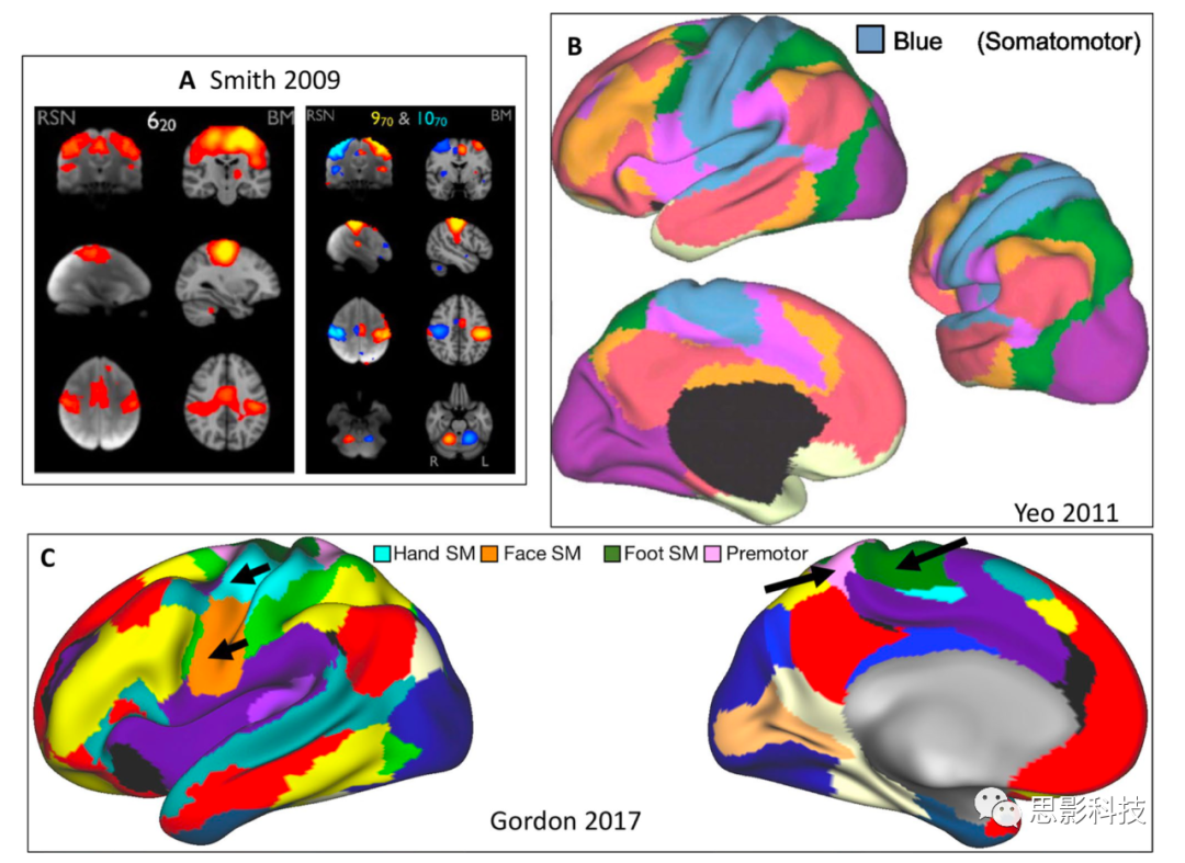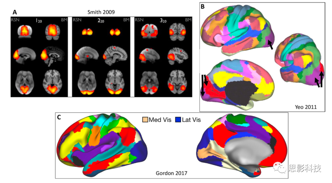 Yeo等人提出了一種基于靜息態(tài)fMRI數(shù)據(jù)的網(wǎng)絡(luò)識(shí)別方案,該方案非常有影響力。Yeo和他的同事使用一種聚類算法將大腦皮層分成功能耦合的大腦區(qū)域網(wǎng)絡(luò)。這里的假設(shè)和在類似靜息狀態(tài)fMRI分割工作中,皮質(zhì)網(wǎng)絡(luò)可以被定義為具有相似皮質(zhì)-皮質(zhì)功能連通性剖面的區(qū)域集合。他們繼續(xù)檢驗(yàn)衍生聚類的穩(wěn)定性,以得到粗(7個(gè)網(wǎng)絡(luò))和細(xì)(17個(gè)網(wǎng)絡(luò))的解決方案。盡管如此,他們?nèi)匀恢?jǐn)慎地表示,對(duì)7和17網(wǎng)絡(luò)解決方案的關(guān)注不應(yīng)被視為暗示替代方案中缺乏有意義的特性。事實(shí)上,在同樣的工作中,他們證明了多個(gè)網(wǎng)絡(luò)解決方案表現(xiàn)出相似的穩(wěn)定性水平,強(qiáng)調(diào)了這一點(diǎn),即:通常沒有一個(gè)正確的解決方案或網(wǎng)絡(luò)的數(shù)量。