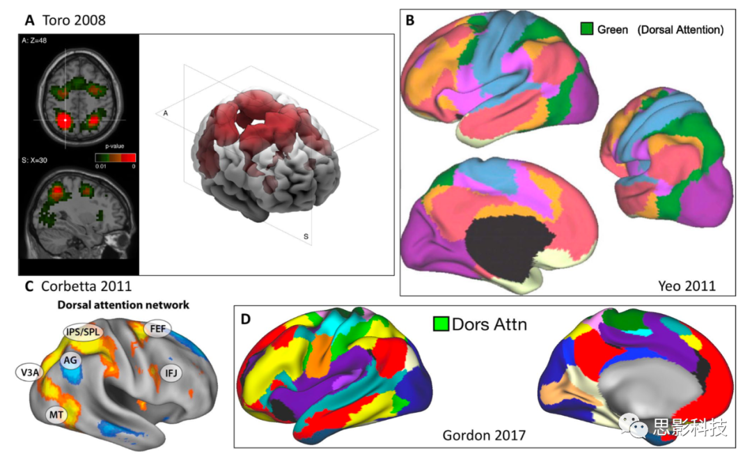 請(qǐng)注意,該網(wǎng)絡(luò)的解剖學(xué)名稱與Corbetta和Shulman最初提出的名稱相同。由于該系統(tǒng)在視覺空間注意中的廣泛作用,這個(gè)網(wǎng)絡(luò)被貼上了認(rèn)知標(biāo)簽“注意”。該系統(tǒng)的功能包括先前確定的“背側(cè)額頂葉網(wǎng)絡(luò)”的過程,該過程準(zhǔn)備并應(yīng)用自上而下的刺激和反應(yīng)選擇。