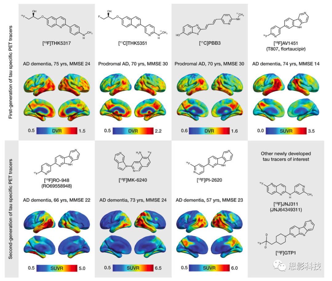 病理性錯(cuò)誤折疊tau蛋白的累積是一類神經(jīng)退行性疾病(統(tǒng)稱為tau?。┑墓残蕴卣?,其中阿爾茨海默?。?span>AD)是最為常見的。相關(guān)疾病還包括進(jìn)行性核上性麻痹(PSP)、皮質(zhì)基底綜合征(CBS)、唐氏綜合征(DS)、帕金森病(PD)和路易體癡呆(DLB)。得益于近期涌現(xiàn)的用于正電子發(fā)射斷層掃描(PET)的tau特異性配體,現(xiàn)在可以研究tau病理在這些疾病的發(fā)生和發(fā)展過程中所起的作用。這些配體包括第一代化合物例如[18F] THK5317,[18F]THK5351,[18F]AV1451和[11C]PBB3)和第二代化合物[[18F]MK-6240,[18F] RO-948, [18F]PI-2620,[18F]GTP1,[18F]PM-PBB3,和[18F]JNJ64349311及其衍生物[18F]JNJ-067)]。