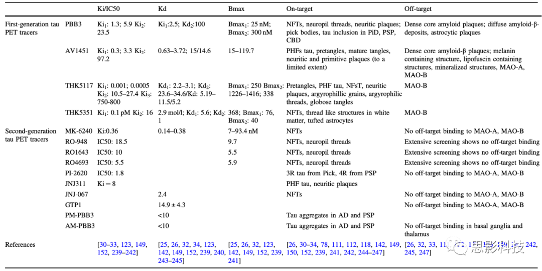 對(duì)第一代tau示蹤劑進(jìn)行廣泛的體外表征,在AD大腦的冷凍和石蠟切片上使用自放射成像,并與tau沉積物和其他特征的免疫染色進(jìn)行比較,以確定其結(jié)合特性。THK5117、THK5351、PBB3和AV1451都與細(xì)胞內(nèi)和細(xì)胞外神經(jīng)纖維纏結(jié)(NFTs)以及ghost纏結(jié)和神經(jīng)斑塊(表1)結(jié)合。然而,出現(xiàn)了與前纏結(jié)結(jié)合的矛盾:Ono等人報(bào)道PBB3和AV1451都沒有結(jié)合,而最近,Wren等人顯示THK5117和T726結(jié)合。最后,Wren等人的研究報(bào)告了病例間和病例內(nèi)的差異。本研究強(qiáng)調(diào),需要對(duì)不同tau示蹤劑的結(jié)合特征進(jìn)行更詳細(xì)和完整的研究,以便能夠得出它們與不同tau特征的關(guān)系的結(jié)論,包括所涉及的tau類型,纖維異構(gòu)體,tau沉積物的成熟度水平,以及受影響的細(xì)胞類型。表1 體外研究中選擇的第一代和第二代tau示蹤劑的結(jié)合特性