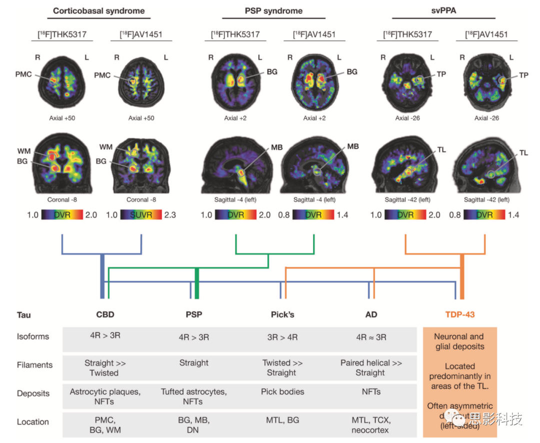 與非tau蛋白沉積物脫靶結(jié)合:現(xiàn)有的tau示蹤劑是小分子的,盡管我們認(rèn)為它們對(duì)tau本身具有特異性,但它們的特異性實(shí)際上是基于tau β-折疊的結(jié)構(gòu),當(dāng)tau在AD或其他tau病中形成不同種類的原纖維時(shí),tau β-折疊被采用。然而,這種結(jié)構(gòu)并非tau所獨(dú)有,它也存在于淀粉樣蛋白-β、TDP-43、α-突觸核蛋白等形成的原纖維中。例如,[18F]FDDNP是第一種注射在體內(nèi)對(duì)tau蛋白病理具有親和力的示蹤劑,比第一代和第二代tau蛋白示蹤劑早幾年被開發(fā)出來,與其他β-折疊結(jié)構(gòu)相比,FDDNP對(duì)tau蛋白缺乏特異性,這限制了對(duì)其進(jìn)一步的開發(fā)。這種特異性問題應(yīng)該作為一個(gè)例子,表明需要廣泛驗(yàn)證目前正在開發(fā)的tau示蹤劑的結(jié)合特性。有趣的是,第一代tau示蹤劑的首次體外研究強(qiáng)調(diào)了與tau蛋白的選擇性結(jié)合,而不是與其他原纖維的選擇性結(jié)合,但現(xiàn)在越來越多的證據(jù)表明,這些示蹤劑可能與其他蛋白質(zhì)沉積物結(jié)合。例如,[18F]AV1451和氟-18 THK配體在原發(fā)性進(jìn)行性失語(yǔ)癥語(yǔ)義變體(svPPA)患者的PET研究中都表現(xiàn)出相似的特征性區(qū)域結(jié)合模式,這種臨床綜合征主要與TDP-43病理相關(guān),而不是tau病理相關(guān)(圖3)。此外,[18F]AV1451和[11C]PBB3在體內(nèi)與預(yù)期有α-突觸核蛋白沉積的患者結(jié)合,這與最近的一些體外研究相一致,至少對(duì)于[11C]PBB3。然而,到目前為止,放射自顯影結(jié)果并沒有證實(shí)THK5351和AV1451在體外與α-突觸核蛋白沉積結(jié)合。