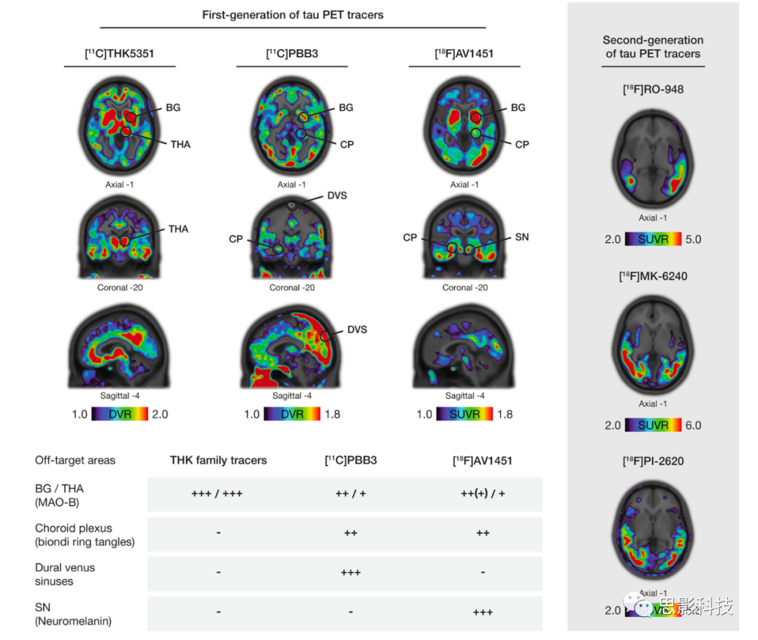 與其他分子結(jié)構(gòu)脫靶結(jié)合:據(jù)報(bào)道,第一代示蹤劑,特別是基底神經(jīng)節(jié)中的MAO-B酶,會(huì)與tau蛋白沉積以外的分子結(jié)構(gòu)偏離靶結(jié)合(圖4),這一發(fā)現(xiàn)已在體外得到驗(yàn)證,至少對(duì)于THK示蹤劑和[18F]AV1451。這可能會(huì)限制這些PET示蹤劑的臨床有效性,至少在tau沉積在MAO-B高負(fù)荷區(qū)域;然而,這對(duì)等皮質(zhì)信號(hào)解釋的潛在影響尚不清楚。盡管第二代示蹤劑的脫靶結(jié)合尚未被詳細(xì)描述,但它們被認(rèn)為與MAO-B富區(qū)較低或沒有信號(hào)有關(guān)(圖4)。