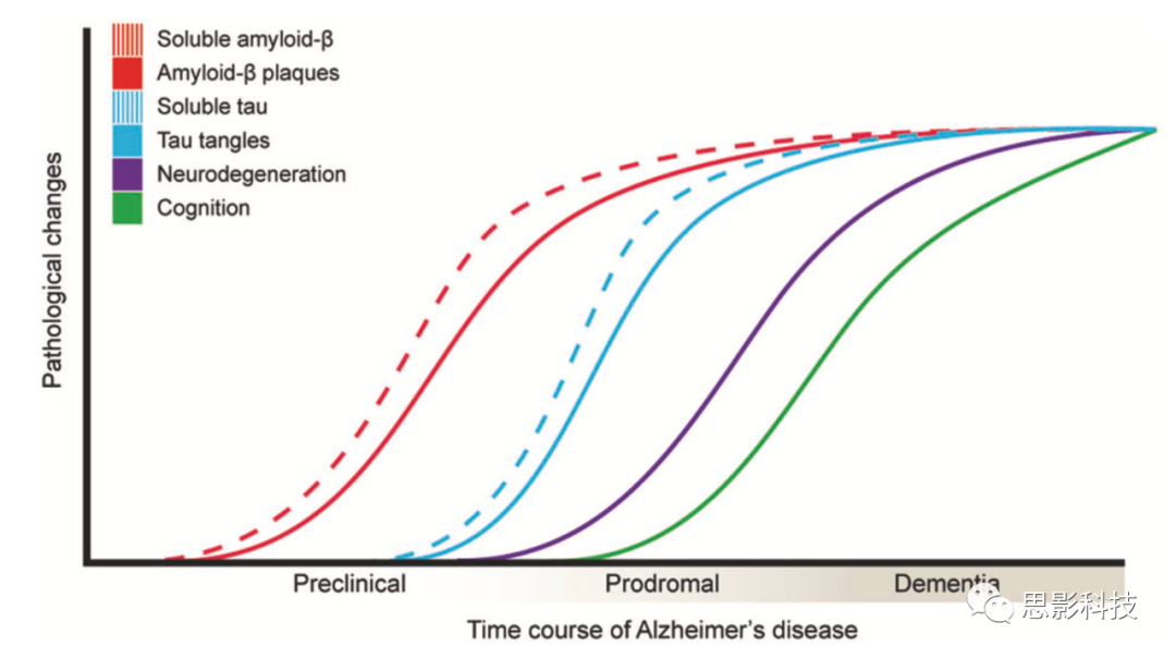 雖然A/T/N框架假設(shè)生物標(biāo)志物可互換性,但它承認(rèn)CSF和PET測(cè)量之間存在時(shí)間延遲,在PET基礎(chǔ)標(biāo)志物變化之前,β淀粉樣蛋白和tau病理可溶性水平的出現(xiàn)增加。雖然這一框架承認(rèn)了該領(lǐng)域許多人的共同思想,即β淀粉樣蛋白驅(qū)動(dòng)AD的發(fā)病機(jī)制,病理性tau作為次要事件發(fā)生,接近神經(jīng)退行性變和認(rèn)知能力下降(圖6),但它也指出其他病理序列也可能存在。事實(shí)上,在組織病理學(xué)文獻(xiàn)中,β淀粉樣蛋白和tau觀點(diǎn)都已明確。從第三個(gè)角度來看,多種而非單一的病理機(jī)制被認(rèn)為是大多數(shù)癡呆病的基礎(chǔ)。相關(guān)的發(fā)現(xiàn)也被描述為tau實(shí)際上先于腦干和MTL中的β淀粉樣蛋白。盡管基于AD的主要生物標(biāo)志物模型假設(shè)β淀粉樣蛋白標(biāo)志物首先異常,其次是tau和神經(jīng)退行性變,但其最新迭代認(rèn)識(shí)到tau可能先于β淀粉樣蛋白,由于其存在更大的敏感性,這些可以通過免疫組織學(xué)檢測(cè)到,而不是當(dāng)前的生物標(biāo)志物。因此,生物標(biāo)志物和組織病理學(xué)數(shù)據(jù)提示的β淀粉樣蛋白和tau-纏結(jié)病理的部分不同的時(shí)間依賴軌跡可能與個(gè)人觀點(diǎn)和檢測(cè)閾值有關(guān)。