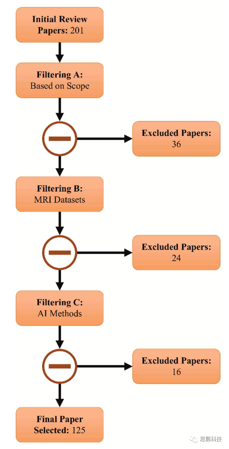 本文最初篩選了201篇文章,但其中36篇不在我們研究范圍內(nèi),因此被排除。另外,有24篇論文因未使用MRI數(shù)據(jù)集,以及16篇未使用AI方法而被排除。最終,有125篇論文入選本研究,并經(jīng)過(guò)了仔細(xì)審查。圖3描述了根據(jù)PRISMA指南選擇文章的流程。表1總結(jié)了在SZ檢測(cè)領(lǐng)域選擇文章的納入和排除標(biāo)準(zhǔn)。