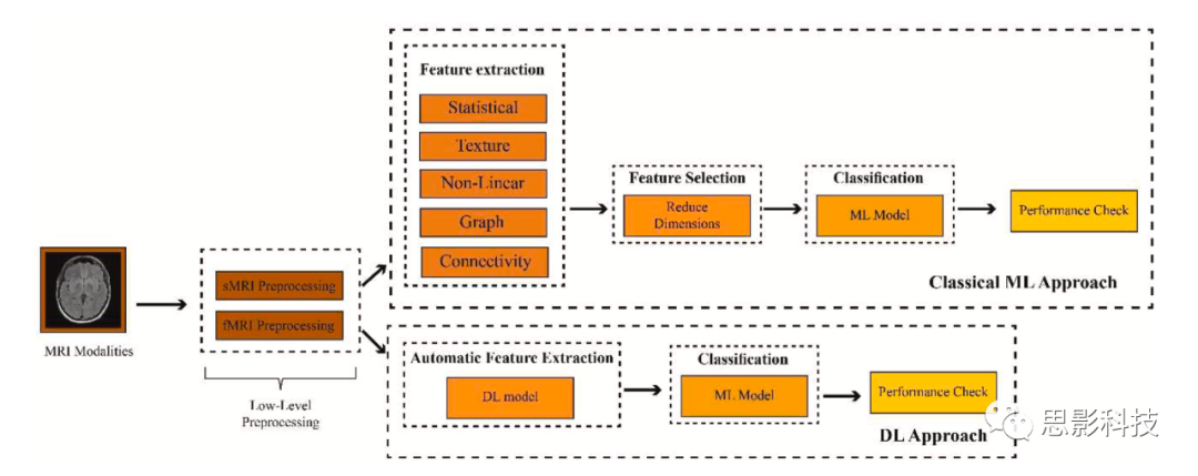 如今,研究人員已經(jīng)開(kāi)發(fā)了用于利用MRI模態(tài)影像診斷各種腦部疾病的CADS,如癲癇、ASD、多動(dòng)癥和SZ。CADS采用ML或DL方法實(shí)現(xiàn)SZ的診斷。這兩類人工智能方法如圖5所示。