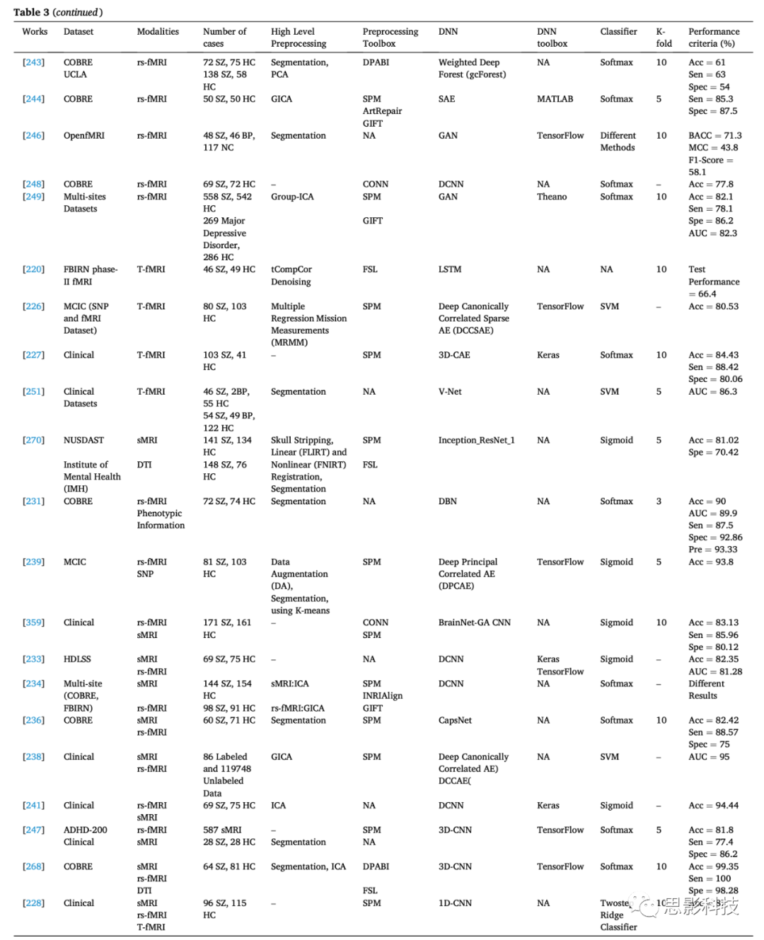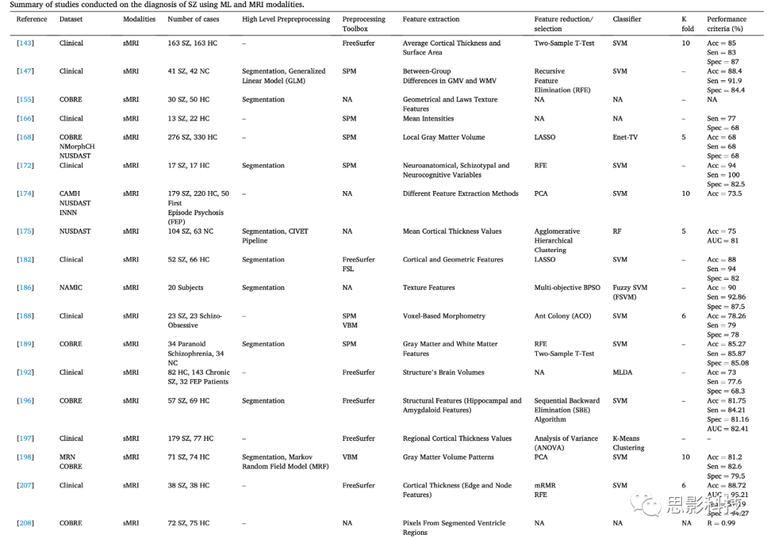 第四節(jié)介紹了基于AI的計(jì)算機(jī)輔助診斷系統(tǒng)(CADS)在精神分裂癥(SZ)診斷中的應(yīng)用。首先,我們討論了使用機(jī)器學(xué)習(xí)(ML)技術(shù)診斷SZ的CADS,包括數(shù)據(jù)集、預(yù)處理、特征提取、特征選擇和分類方法。表2總結(jié)了使用ML技術(shù)進(jìn)行SZ診斷的研究。此外,本節(jié)還全面涵蓋了基于深度學(xué)習(xí)(DL)的CADS(表3)。 在第五節(jié)中,我們回顧了每年使用AI方法診斷SZ的一些研究,并討論了在SZ診斷研究中使用的ML和DL方法的數(shù)據(jù)集數(shù)量。我們還指出了SZ診斷研究中使用的MRI神經(jīng)影像模態(tài)的數(shù)量。用于SZ診斷的MRI模態(tài)的預(yù)處理工具在單獨(dú)的章節(jié)中進(jìn)行了總結(jié)。最后,我們討論了使用ML和DL方法診斷SZ的分類算法。
