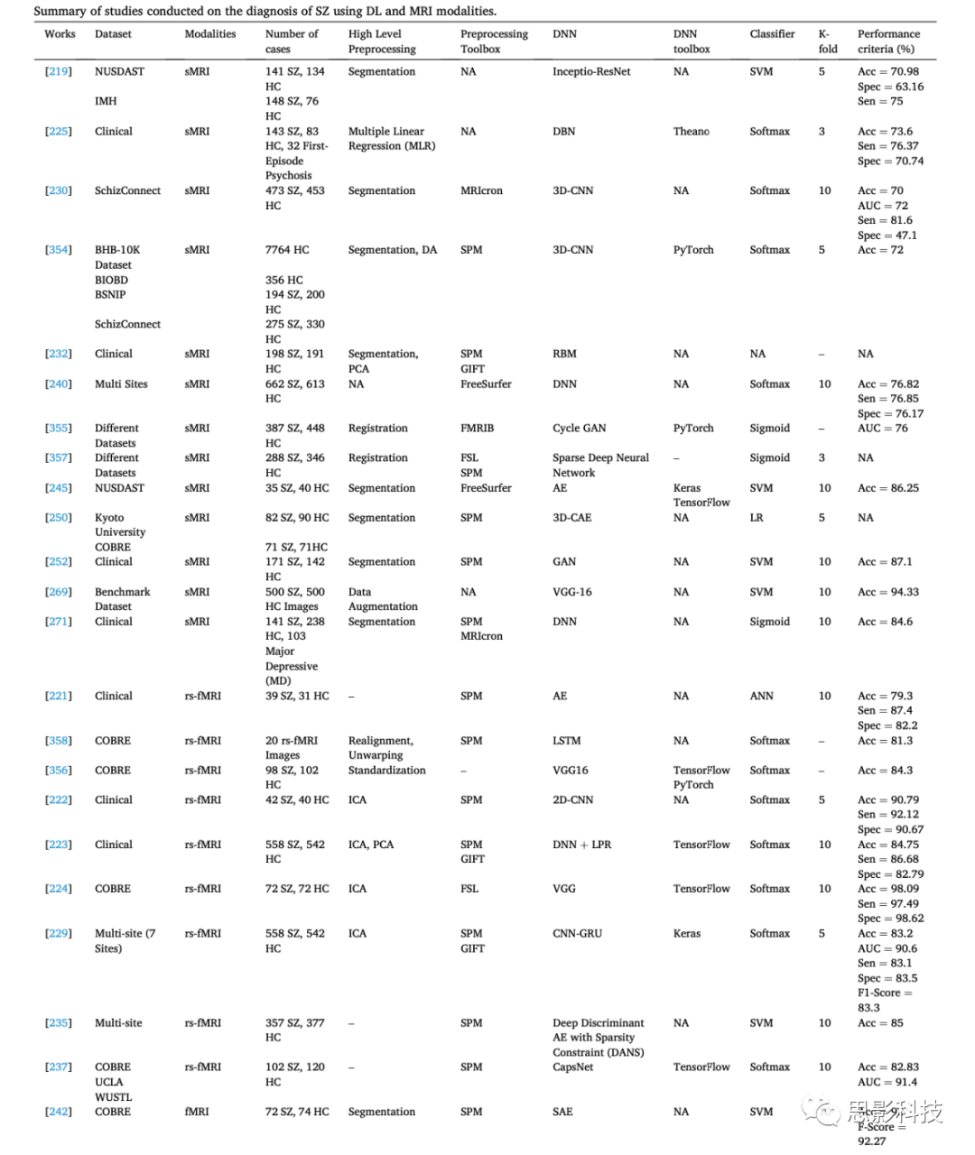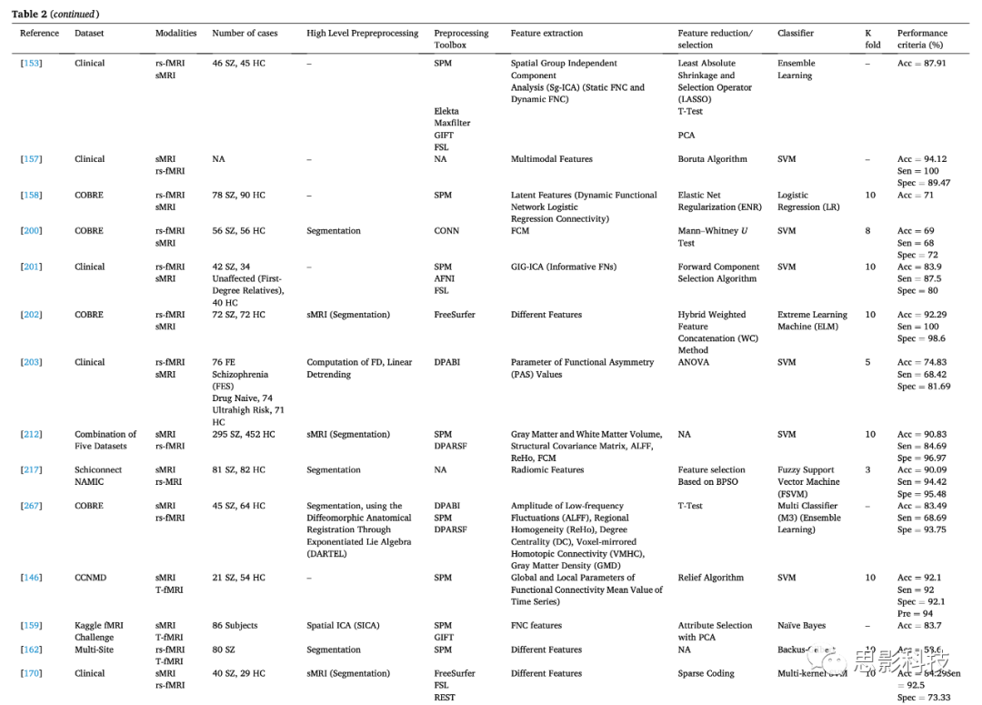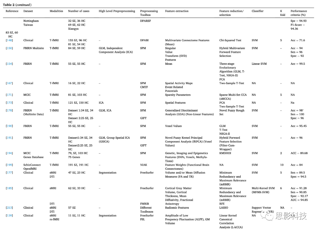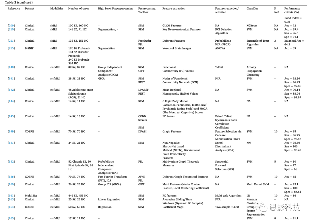 8.結(jié)論和未來(lái)工作 精神分裂癥(SZ)是一種直接影響大腦的精神障礙,會(huì)導(dǎo)致言語(yǔ)和理解能力受損。本文總結(jié)了使用MRI神經(jīng)影像開(kāi)發(fā)的各種自動(dòng)化系統(tǒng),以實(shí)現(xiàn)SZ的早期準(zhǔn)確檢測(cè)。研究結(jié)果表明,與其他診斷方法相比,sMRI和fMRI神經(jīng)影像為醫(yī)生提供了關(guān)于大腦功能的重要信息,有助于準(zhǔn)確診斷SZ。結(jié)合ML和DL技術(shù)的MRI模態(tài)已被應(yīng)用于幫助臨床醫(yī)生準(zhǔn)確診斷SZ。