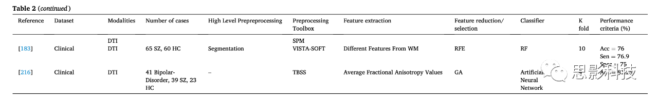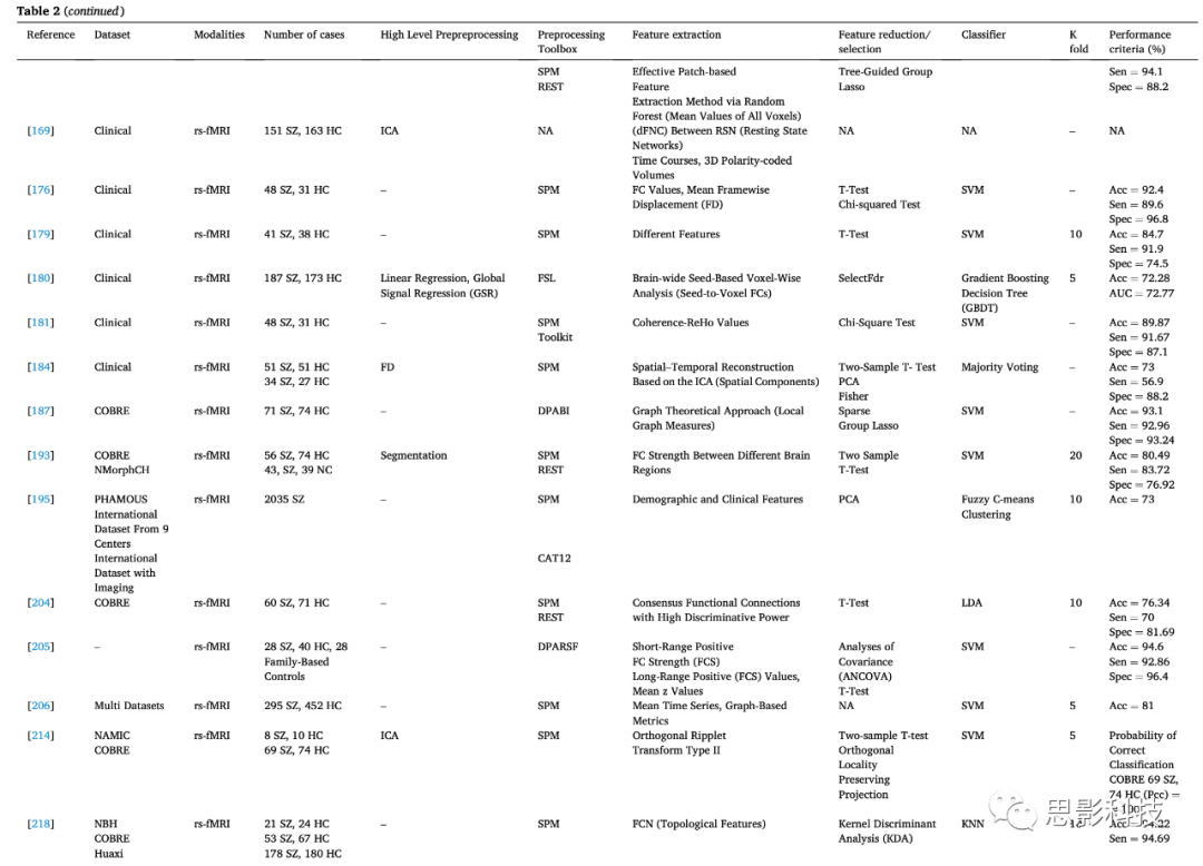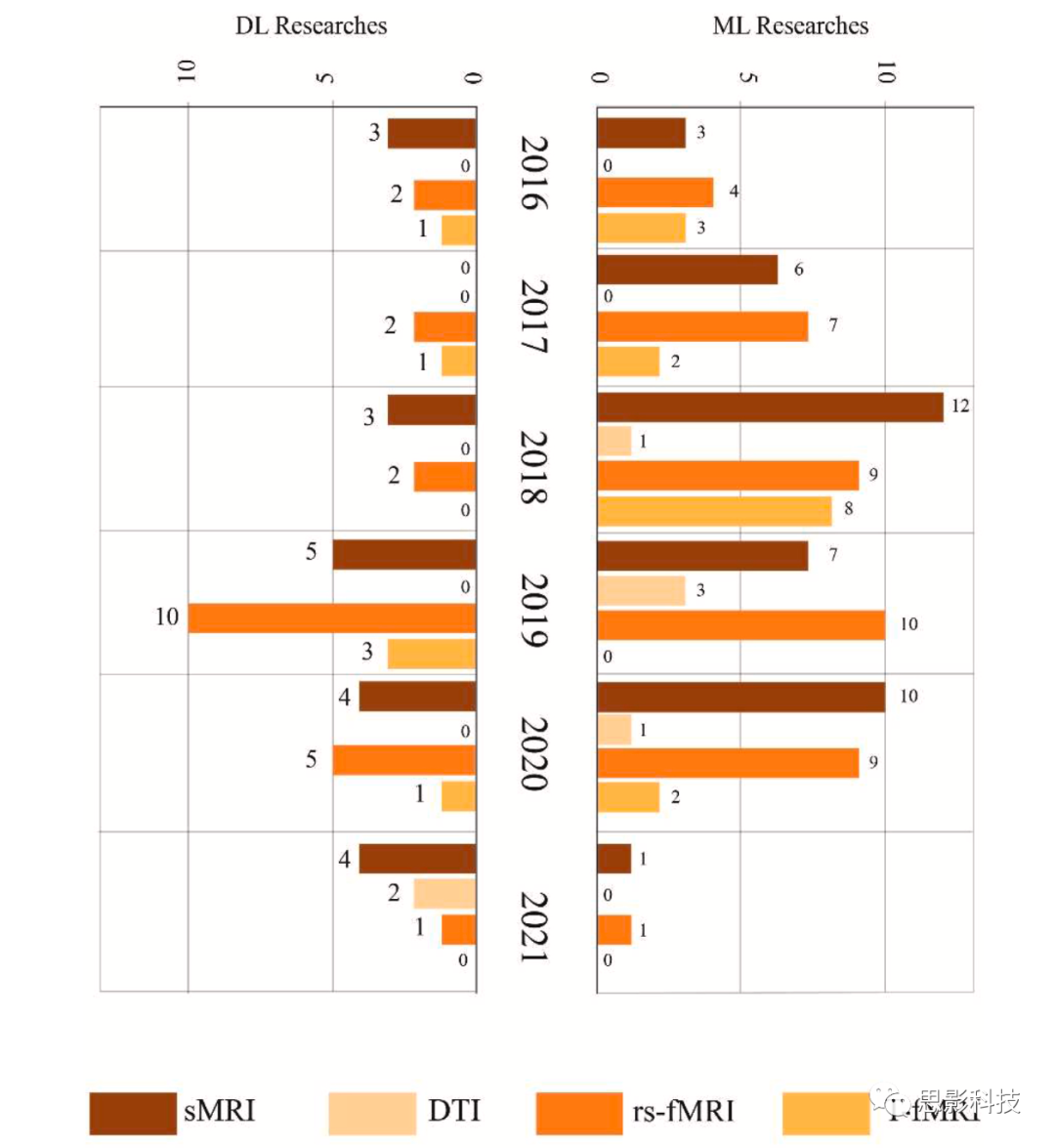 圖17顯示了表2和表3中用于診斷SZ的sMRI和fMRI神經(jīng)影像的類型。由此可見(jiàn),rs-fMRI已經(jīng)得到了廣泛的應(yīng)用;近年來(lái),使用sMRI和rs-fMRI神經(jīng)成像模態(tài)對(duì)SZ自動(dòng)化檢測(cè)進(jìn)行了更多的研究。