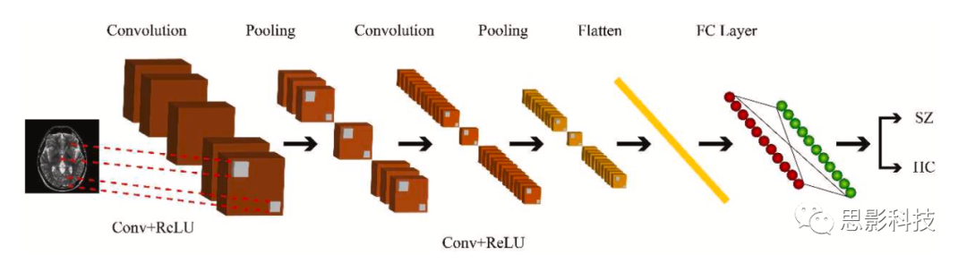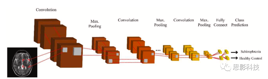 自20世紀(jì)60年代以來(lái),計(jì)算機(jī)視覺(jué)和圖像處理一直是許多研究者關(guān)注的領(lǐng)域。然而,由于圖像的高維性,圖像處理任務(wù)(如分類和分割)一直面臨著挑戰(zhàn)。2012年推出的AlexNet是一種具有2D卷積層的深度神經(jīng)網(wǎng)絡(luò),可以高精度地完成圖像分類任務(wù)。從那時(shí)起,出現(xiàn)了許多旨在提高先前模型性能的其他模型,如VGG、GoogleNet等。此外,還開(kāi)發(fā)了其他形式的2D-CNN,使其適用于其他數(shù)據(jù)類型,如更適用于EEG的1D-CNN。這些網(wǎng)絡(luò)設(shè)計(jì)相對(duì)簡(jiǎn)單且性能較高;但它們不像其他方法那樣可以針對(duì)特定任務(wù)進(jìn)行定制。圖8顯示了使用MRI自動(dòng)檢測(cè)SZ的2D-CNN架構(gòu)。