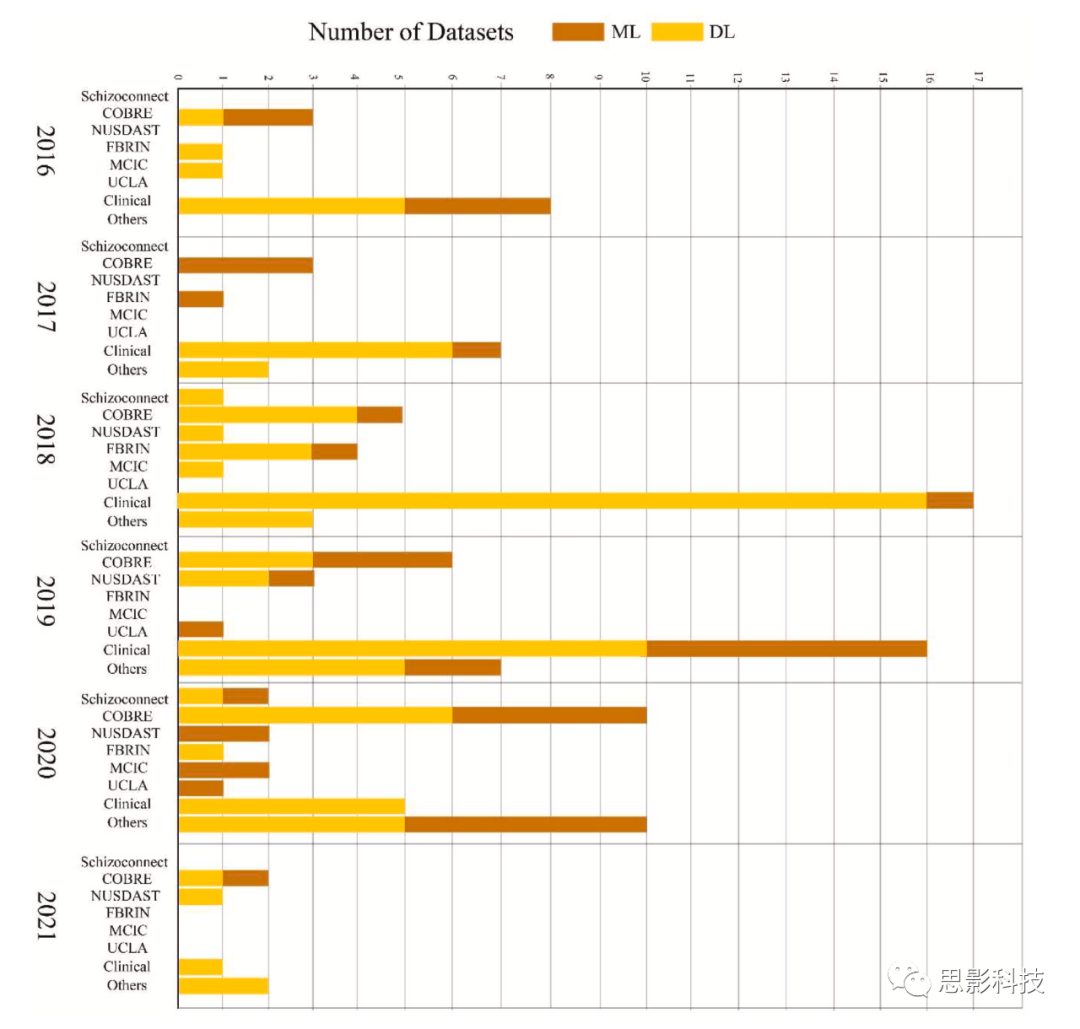從第4.1節(jié)可以注意到,有幾個(gè)免費(fèi)可用的數(shù)據(jù)集可用于SZ的自動(dòng)診斷。每年提出的用于開(kāi)發(fā)DL和ML模型的數(shù)據(jù)集數(shù)量如圖16所示。從該圖中可以注意到,在SZ的自動(dòng)檢測(cè)研究中,COBRE數(shù)據(jù)集由于正常對(duì)照組和精神分裂癥數(shù)量較平衡而比其他數(shù)據(jù)集更高效、更受歡迎。