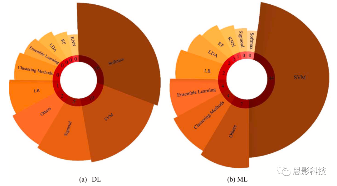 圖19所示為2016年后發(fā)表的論文中使用ML和DL方法自動(dòng)檢測(cè)SZ的分類算法的數(shù)量。從圖19(a)可以看出,Softmax方法被廣泛用于分類。SVM分類器被廣泛用于ML方法中(圖19(b))。