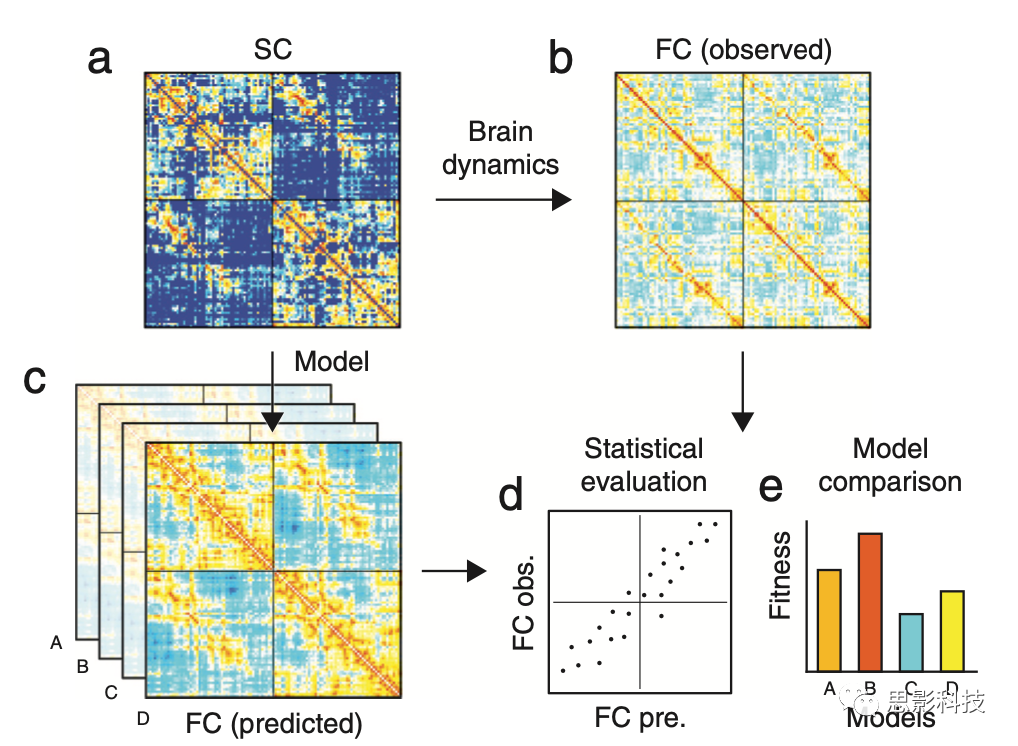 圖 2.2 受結(jié)構(gòu)約束的FC模型。結(jié)構(gòu)連接(a)約束大腦動力學(xué),從而導(dǎo)致相關(guān)的大腦活動,這些活動被測量為FC(b)。為了更好地理解這種結(jié)構(gòu)-功能關(guān)系,可以構(gòu)建大腦動力學(xué)模型,作為輸出產(chǎn)生合成的FC模式(c)。這個框架使得可以測試不同的模型,這些模型對應(yīng)于關(guān)于大腦動力學(xué)/通信的不同假設(shè),具有不同程度的復(fù)雜性和生物物理合理性(d)。模型性能可以量化為觀察到的FC和預(yù)測FC之間的相關(guān)性(e)。模型之間可以根據(jù)它們的性能作為適應(yīng)度衡量進(jìn)行比較,以識別最優(yōu)的動力學(xué)模型。 生物學(xué)中的一個核心問題涉及生物體結(jié)構(gòu)與其能夠執(zhí)行的功能之間的關(guān)系。在網(wǎng)絡(luò)神經(jīng)科學(xué)的背景下,我們可以問一個類似的問題——大腦的解剖結(jié)構(gòu)如何塑造大腦遠(yuǎn)離部位之間的功能耦合模式?直觀地說,我們認(rèn)為解剖連接是一組約束條件——大腦的某些部位通過白質(zhì)或軸突投射直接耦合在一起,而其他部位則沒有。那些連接在一起的部位可以方便地互換信息或相互發(fā)信號——而那些缺乏直接連接的部位只能通過多步路徑間接交流,從而塑造大腦活動的相關(guān)結(jié)構(gòu)。這種功能與基礎(chǔ)解剖結(jié)構(gòu)的耦合是大腦網(wǎng)絡(luò)的一個基本特征,當(dāng)其被破壞或擾亂時,可能導(dǎo)致不適應(yīng)行為和疾病。結(jié)構(gòu)功能耦合的破壞可能正是我們應(yīng)該通過深部腦刺激(參見第1章)來調(diào)整的目標(biāo)。