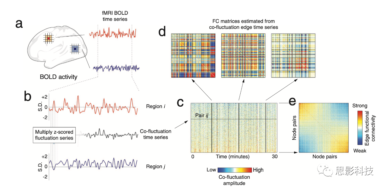 該過程可以針對每一對大腦區(qū)域(網(wǎng)絡(luò)中的所有邊)進(jìn)行,生成一整套共波動時間序列(也稱為“邊時間序列”),具有有用的特性。首先,我們可以將邊時間序列視為功能連接的時間分解;任何一對節(jié)點(diǎn)的共波動時間序列的時間平均值正好是這些節(jié)點(diǎn)之間功能連接的權(quán)重。有了這種分解,我們可以評估單個幀對平均功能連接的貢獻(xiàn)。此外,如果我們在某個時間點(diǎn)“切片”邊時間序列,我們將獲得所有邊對的瞬時共波動模式,可以將其重新整形為一個區(qū)域與區(qū)域的矩陣并作為網(wǎng)絡(luò)進(jìn)行分析。因此,邊時間序列在不使用滑動窗口的情況下量化網(wǎng)絡(luò)結(jié)構(gòu)的時變變化,從而提高了時間分辨率。