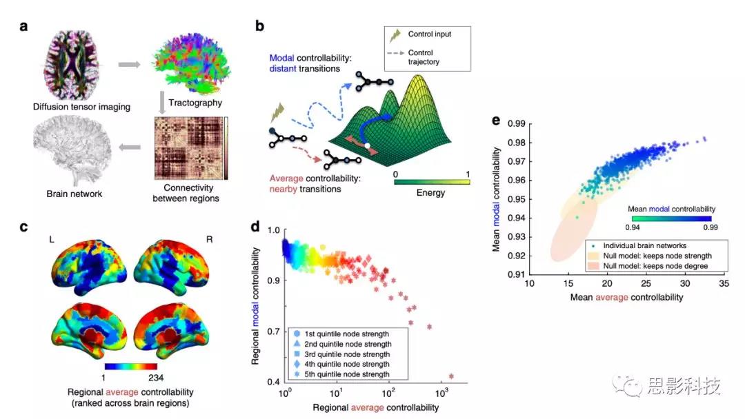 作者研究了兩種不同的控制策略,它們描述了將網(wǎng)絡移動到不同狀態(tài)的能力,這些狀態(tài)被定義為區(qū)域活動的模式(圖1b)。平均可控性描述了從一種狀態(tài)上轉換到附近其他狀態(tài)的容易程度,而模態(tài)可控性描述了在這個狀態(tài)上轉換到一個遙遠狀態(tài)的容易程度。