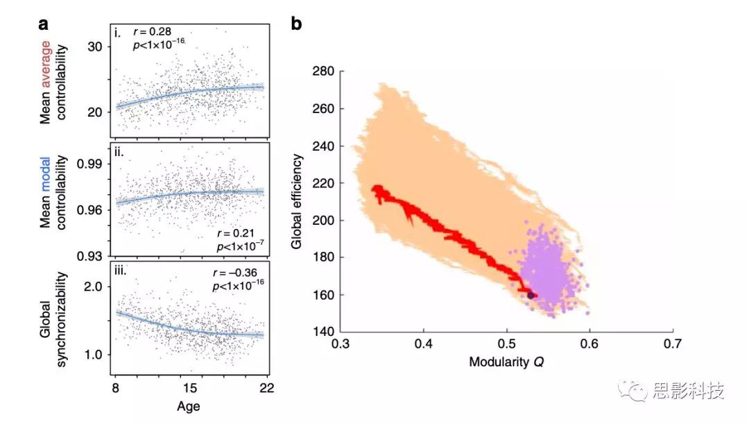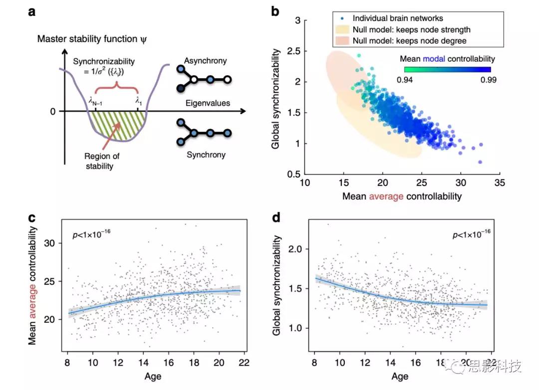 為了檢驗該假設,作者考察了基于彌散張量成像的大腦結構網(wǎng)絡的可控性和同步性,作者使用加權鄰接矩陣或圖論來表示這些數(shù)據(jù)。在一個包含882名8~12歲年輕人的樣本中計算了可控性和同步性之間的關系。結果表明,隨著大腦的發(fā)育,大腦網(wǎng)絡會因不同的動態(tài)而優(yōu)化,并且超出了網(wǎng)絡結構模塊變化所能解釋的范圍。此外,該研究還為以下假設提供了支持性證據(jù),即大腦不同區(qū)域可控性的平衡對于實現(xiàn)最佳的認知功能是必需的。