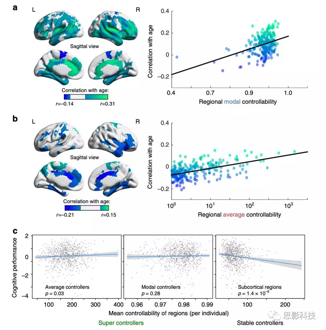 圖3. 區(qū)域特異化與年齡的關系及其對認知的影響。a (左)模態(tài)可控性隨年齡顯著增加的區(qū)域(綠色)和模態(tài)可控性隨年齡顯著降低的區(qū)域(深藍色)。(右)從年齡相關與區(qū)域模態(tài)可控性值之間的正斜率可以看出,綠色區(qū)域傾向于更強的模態(tài)控制器(“超級控制器”)。b (左)平均可控性隨年齡顯著增加的區(qū)域(綠色)和平均可控性隨年齡顯著降低的區(qū)域(深藍色)。(右)從年齡相關性與區(qū)域平均控制性值之間的正斜率可以看出,綠色區(qū)域傾向于更強的平均控制器(“超級控制者”)。c (左)超級平均控制器 (綠色區(qū)域,隨著年齡的增長,控制性顯著增強,平均控制性也隨之提高)與認知表現(xiàn)關系不大。(中)超級模態(tài)控制器與認知表現(xiàn)關系不大。(右)在發(fā)展過程中可控性最穩(wěn)定的區(qū)域—皮層下區(qū)域—其平均可控性與認知能力之間存在顯著的負相關。