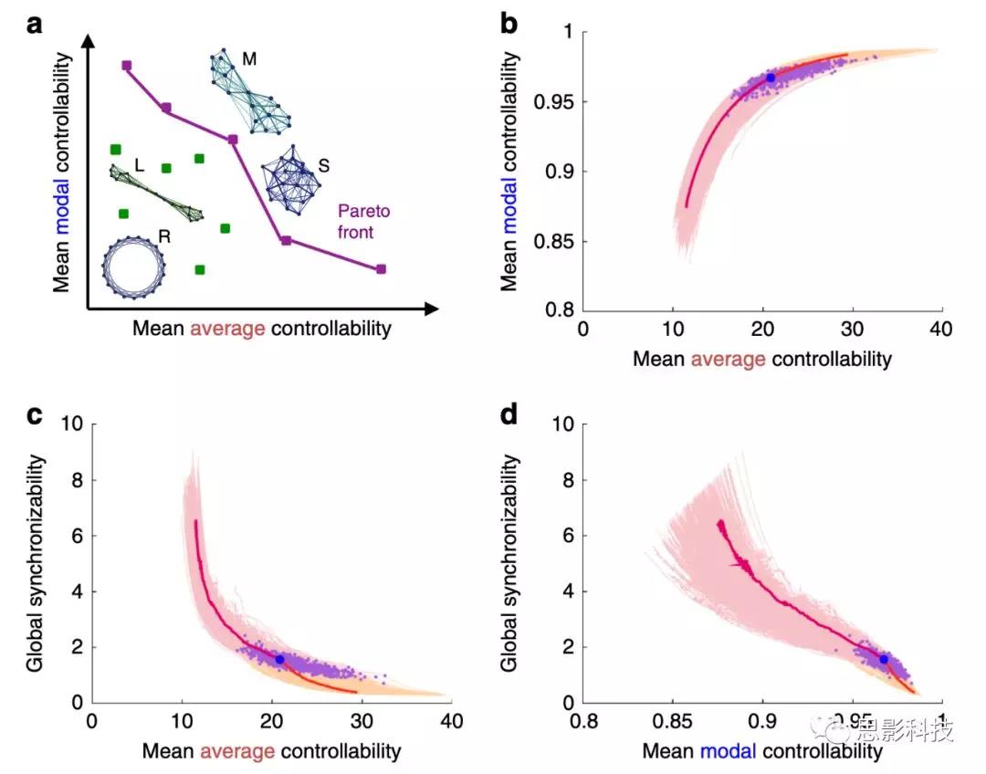 計算過程為,從原始數(shù)據(jù)獲得的大腦網(wǎng)絡開始,隨機選擇網(wǎng)絡中的現(xiàn)有邊進行重新布線(即建立白質連接,這里為模擬建立,并非真實連接),以取代之前不存在的邊。為該新網(wǎng)絡計算可控制性和同步性度量,如果發(fā)現(xiàn)新網(wǎng)絡高于Pareto前沿(圖4a),則重新布的線得以保留;如果不是,則取消重新布線。重復此過程以繪制路線圖,網(wǎng)絡在保持相同的權重分布和平均程度的同時,提高了網(wǎng)絡的可控制性并降低了同步性。為了提供相反的對比,我們在發(fā)展時間方面向前發(fā)展(增加控制并降低同步性),并在發(fā)展時間方面向后發(fā)展(減少控制并提高同步度),即作者從兩個方向去驗證該假設,可以理解為雙尾驗證。