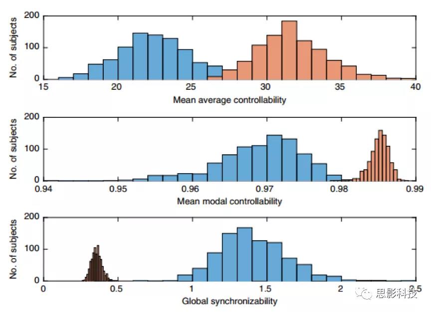 圖5. 大腦網(wǎng)絡顯示出接近最優(yōu)的控制力,但是有限的同步能力。原始的大腦網(wǎng)絡(藍色)和最終進化網(wǎng)絡(橙色)顯示其可控性之間存在重疊(上,中),然而同步性之間沒有重疊(下),表明大腦網(wǎng)絡存在最優(yōu)控制性,但保留有限的同步能力。