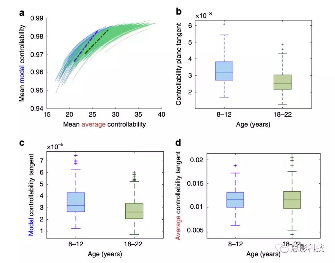 c. 這種差異來自發(fā)展曲線在模態(tài)可控性的差異 (切線組差異:p <0.001),表明與年長的年輕人相比,兒童具有更大的潛力來提高他們對精神狀態(tài)進行遙遠或困難改變的能力。相比之下,在每一個重新布線的步驟中,組間的平均可控性變化差異不大(p = 0.47),這表明在發(fā)展過程中,增加附近的精神狀態(tài)切換的潛力保持不變。