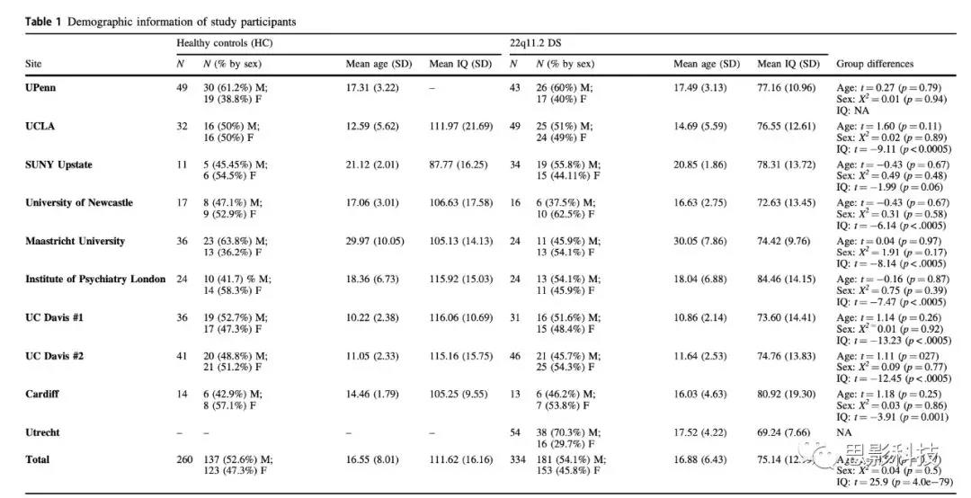 dMRI數(shù)據(jù)來自10家中心,作為ENIGMA-22Q11DS工作組的一部分進行分析。本研究納入594名被試,334名22q11DS(年齡:16.8±6.43,女性:153名)260名健康對照(年齡:16.55±8.01,女性123名)人口學特征(如表1和表S2a,b)。