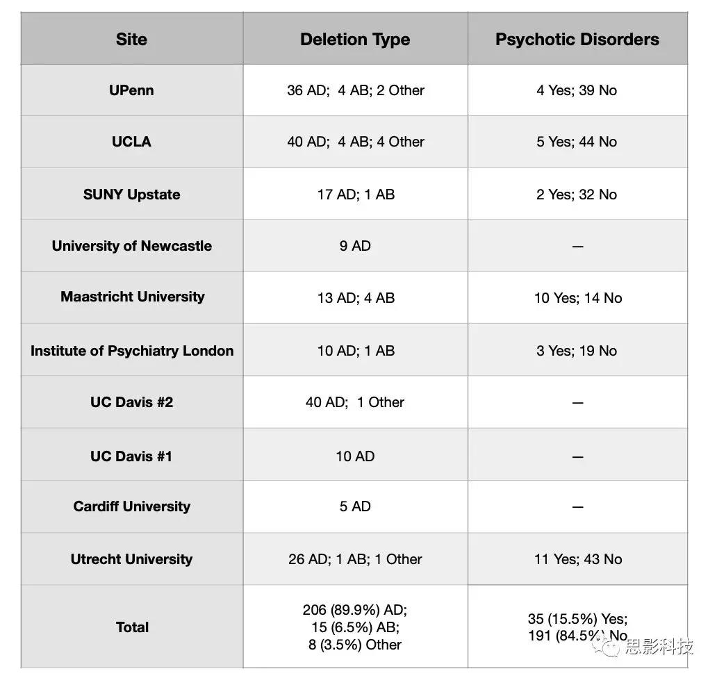 樣本詳細基因型特性測量:所有中心在掃描時均進行了結構式的診斷訪談,確定終身精神病診斷。韋氏智商評估用于評估認知功能。用多重連接探針擴增技術(MLPA)測定缺失大小。本研究大樣本允許獨特地比較兩種最常見的缺失類型(較長的A-D和較短的A-B,兩種不同的基因缺失類型)對DTI結果的影響。從有MLPA數(shù)據(jù)的病例來看,206名受試者存在A-D缺失(89.9%),15名受試者(6.5%)存在A-B缺失(見補充表S3)。