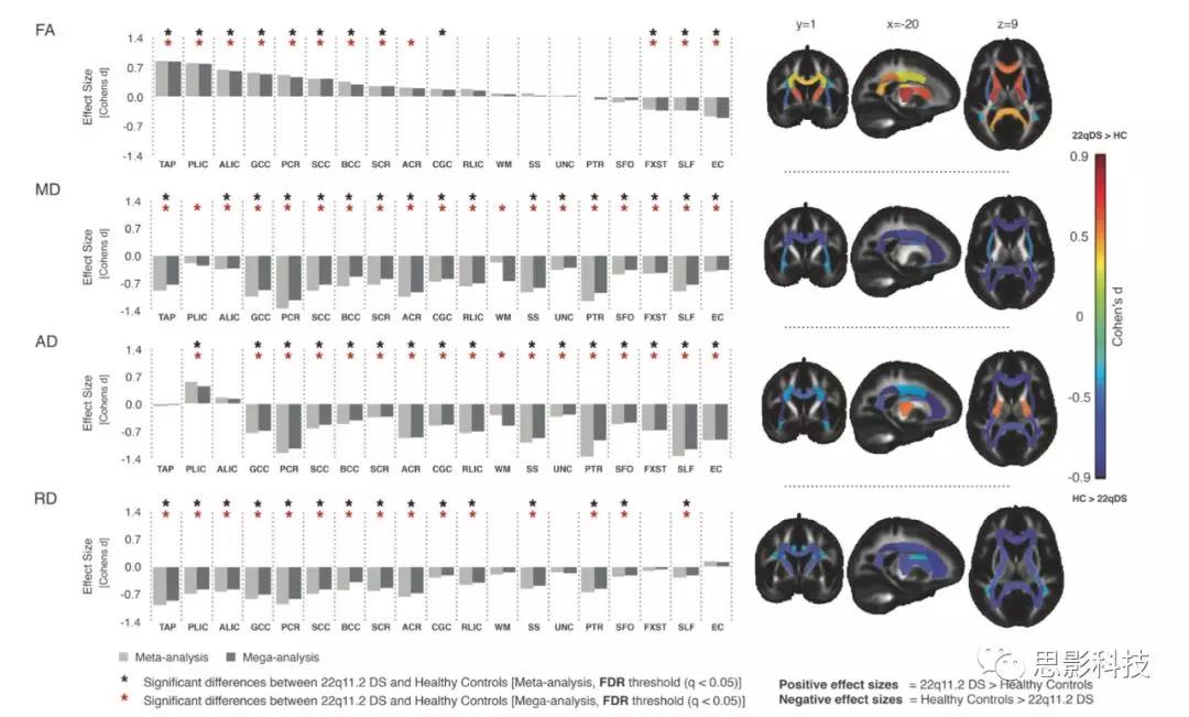 本研究是迄今為止最大的一項在22q11DS中應用DTI探究白質微結構的研究。本研究路線允許跨中心對數(shù)據(jù)進行協(xié)調(diào)前瞻性Meta和mega分析,這與傳統(tǒng)的結合文獻中統(tǒng)計結果的Meta分析不同。本研究方法首次解決了由于樣本量小和變量分析規(guī)程導致的低效能問題,這些問題導致了目前DTI研究的異質性和不清晰性。