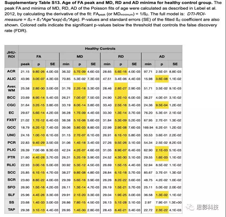 表S13:HC組FA峰值,RD/MD/AD最小估計值年齡