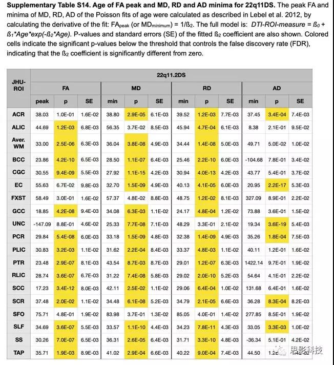 在所有DTI指標中,22q11DS組具有顯著性峰值/最小估計值的ROI較少(見表S13和S14)。