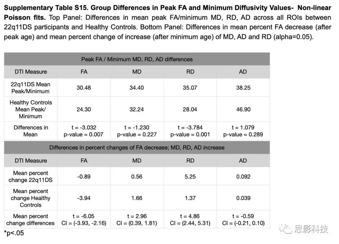 通常,那些沒有顯著性峰值/最小估計的ROI具有線性而不是指數(shù)增長和衰減軌跡。當比較HC和22q11DS之間的峰值FA(跨ROI)的平均年齡時, 22q11DS明顯大。研究發(fā)現(xiàn)在22 q11DS中的最小RD時的平均年齡明顯偏大,但最小MD和AD時的平均年齡沒有差異。HC組在峰值后FA的平均百分比變化和最小RD和MD后的平均百分比變化也明顯大于22 q11DS組,AD無差異(表S15)。