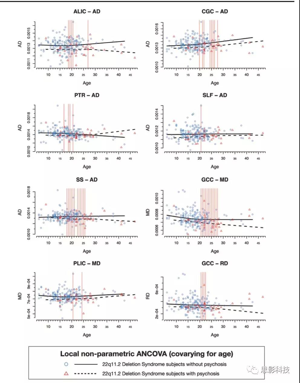 FA、MD、RD和AD值的年齡軌跡,以及對照樣本的峰值和最小年齡估計與之前報道的相似。然而,22q11DS患者的平均峰值FA和最小RD年齡都較大;相應地,在峰值和最小年齡后,F(xiàn)A和MD值的變化百分比也較小。如上所述,這些發(fā)現(xiàn)可能表明成熟延遲繼發(fā)于深部白質軸突直徑和組織的改變,這可能是延遲髓鞘形成過程的前兆。相反,正如22q11DS成人死后尸檢報告顯示,成熟后較小的百分比變化(由峰值FA和最小RD表示)可能表示白質的潛在組織變化,可能是由膠質細胞變化引起的。然而,盡管有統(tǒng)一的協(xié)議,但謹慎解釋是值得的,因為各中心的年齡分布不同,且數(shù)據(jù)在較老的年齡范圍內(nèi)是相對稀疏的。