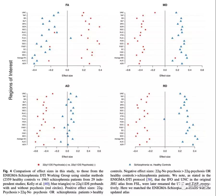 使用由ENIGMA-DTI工作組開發(fā)的處理方案,發(fā)現(xiàn)22q11DS中的平均、軸向和徑向擴散率存在廣泛降低,皮層-皮質和皮質-丘腦纖維最明顯:放射冠、胼胝體、上縱束、丘腦后輻射以及矢狀層(Cohen's d:0.9-1.3)。只有內(nèi)囊后肢,其軸向擴散系數(shù)較高。22q11DS患者胼胝體和投射纖維平均FA比對照組高,但主要區(qū)域FA值比對照組低。22q11DS中的精神障礙與多腦區(qū)的擴散率顯著降低有關??傮w來講,這些發(fā)現(xiàn)表明22q11.2缺失對白質微結構有很大的影響,尤其是在主要的皮層-皮質連接中。結合動物模型的發(fā)現(xiàn),這種異常模式可能反映了外皮質層投射神經(jīng)元神經(jīng)發(fā)生的中斷。