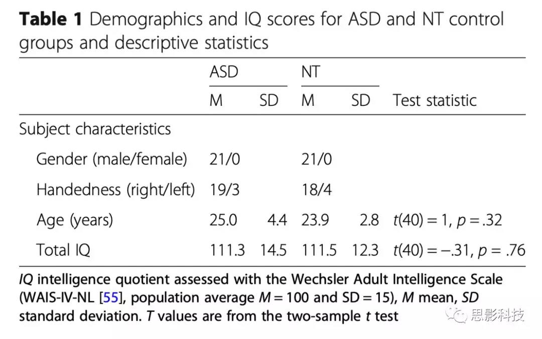 本實驗中的自閉癥患者表現出高于自閉癥患者平均水平的智力和足夠的社會適應能力(例如,21人中有11人有固定的工作,7人是高等教育的學生)。作者的樣本量確定是基于先前的研究,這些研究通過類似的神經成像方法來檢測臨床人群中的非典型神經表現。此外,對行為和神經數據的可靠性進行了徹底的檢查(方法和結果見下文),進一步證明該研究的樣本量是適當的。