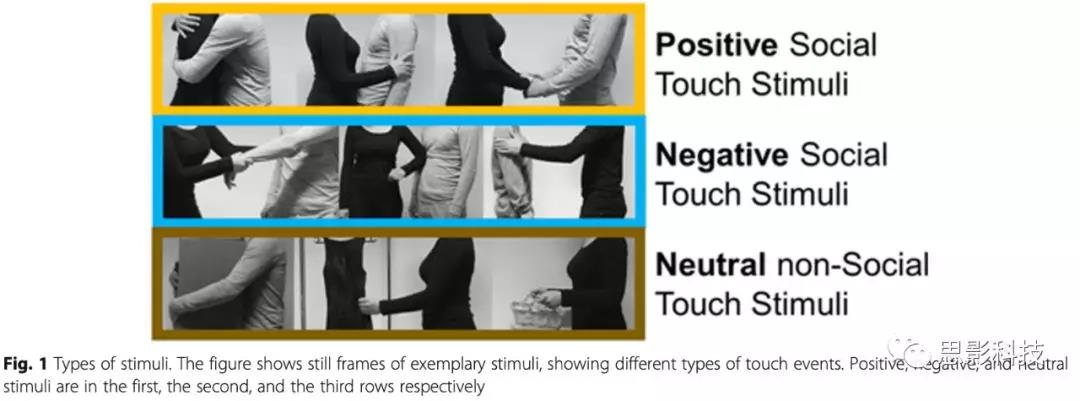 使用了一組最近創(chuàng)建的75個灰度級的視頻剪輯(每個3秒),展示了積極(擁抱或握手)的和消極的(例如,拍擊)人際觸摸交互以及中性的對象操作(例如,拿著一個盒子)。部分視頻的代表性靜止圖像如圖1所示。根據身體接觸的類型,39個人際或社會接觸場景和36個物體操作或非社會接觸場景是緊密匹配的。例如,擁抱另一個人與拿著一個大盒子的動作是相匹配的。將視頻序列的各種物理參數進行量化,包括像素方向的強度、像素方向的運動能量和總運動能量等,保證刺激材料不同類別間的物理屬性的一致性。作者使用psychtoolbox工具呈現實驗程序。