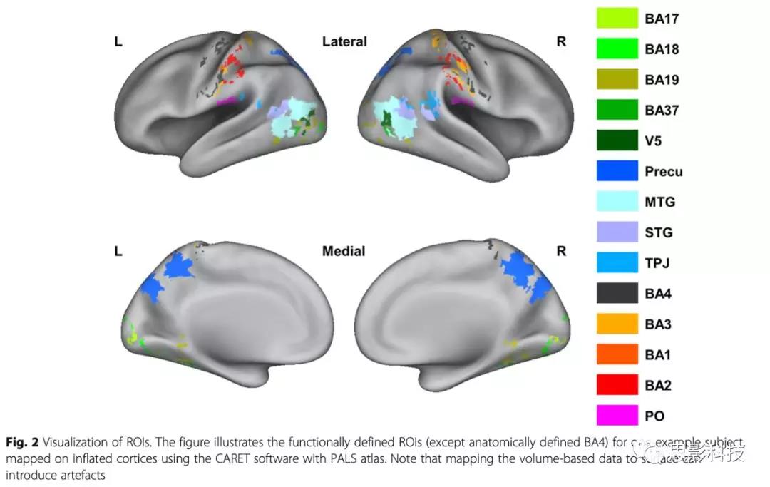 作者使用上述的第三個GLM和第四個GLM來確定ROI。作者使用的ROI區(qū)域包括Brodmann區(qū)(BA) 3、BA1、BA2、頂葉蓋部(PO)、腦島、中扣帶皮層(MCC)、顳中回(MTG)、顳上回(STG)、TPJ、楔前葉、BA17、BA18、BA19、BA37、V5(高級視覺皮層)和BA4。所有這些ROI都參與了NT(典型神經發(fā)育)成人視覺呈現的社會接觸場景的處理。具體為:軀體感覺網絡(BA3、BA1、BA2和PO)、疼痛網絡(insula和MCC)、社會認知網絡(MTG、STG、TPJ和楔前葉)、視覺網絡(BA17、BA18、BA19、BA37和V5)中的替代觸摸處理。運動皮層(BA4)也被包括在內,因為在掃描儀中執(zhí)行任務時,與主動按鍵相關的運動反應是必需的(具體見圖2)。