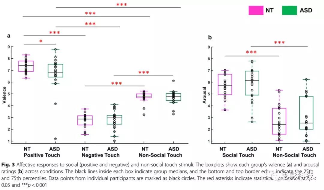 總體而言,兩組人對觸摸視頻的情感意義的感知與預期一致。更具體地說,積極的觸摸視頻被評為愉快(NT,中位數= 7.4(中位數絕對偏差(MAD) = 0.4);ASD,中位= 6.8(0.6)),負性接觸為不愉快(NT,中位= 2.9 (0.3);ASD,中位數= 3(0.5)),非社交接觸為中性(NT,中位數= 4.8 (0.2);ASD,中位數= 4.8(0.2))。