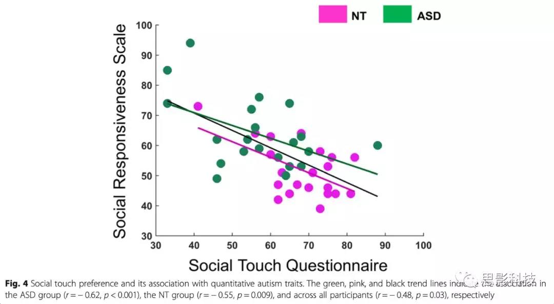 與NT組( M = 69.2, SD = 9.6; t(40) = 3.21, p=0.003, d = 1.07)相比,ASD患者在日常生活中對給予、接受和見證社交接觸的欣賞程度較低(STQ: MASD = 56.8, SDASD = 13.2)。與作者預期一致,與NT個體相比,ASD個體表現出更高數量的自閉癥特征,包括:社會意識、社交能力和社交動力。總的來說,在社會接觸偏好和自閉癥特征數量上發(fā)現了很大的群體差異。相關分析顯示,社會接觸偏好的個體差異與個體所經歷的自閉癥特征數量呈負線性相關,所有被試 r = ? 0.62, p < 0.001; NT group r = ? 0.55, p = 0.009; ASD group r = ? 0.48, p = 0.03(如圖四所示)。